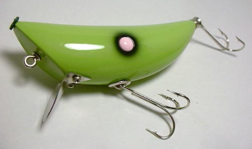 巻いて使うというよりは、上に反ったテイルをピョコピョコと水面上に振り上げながら、平べったい頭部で水面を叩くアクション・・・が理想だったんですが、いざスイムテストしてみると、全然思い通りに動いてくれないんで、今後ボチボチと煮詰めていきたいと思ってます。