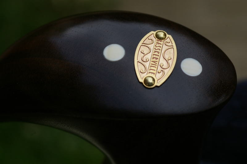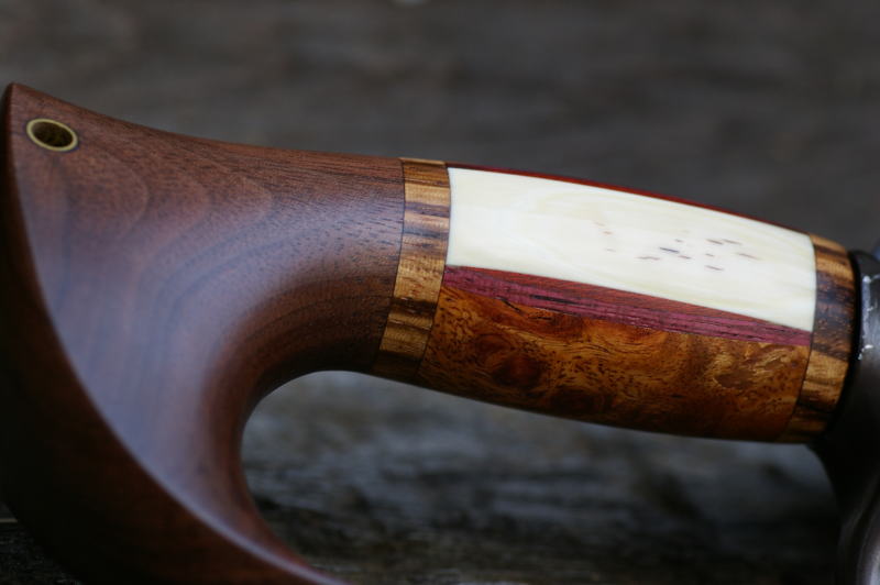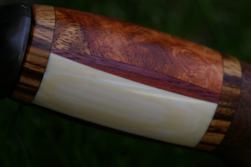 | ■本物のマンモスの牙を使用したグリップ。マンモスと聞いて連想するのは、やっぱりマンモス肉でしょう。 と言う事で、マンモスアイボリーの間に挟む芯材にはレースウッドを使用(レースウッドは別名「ビーフウッド」とも呼ばれます)。 そして、マンモス肉からしたたる血を赤い木「サティーネ」で表現。ギャートルズの世界に出て来そうな(?)グリップに仕上がりました。 |