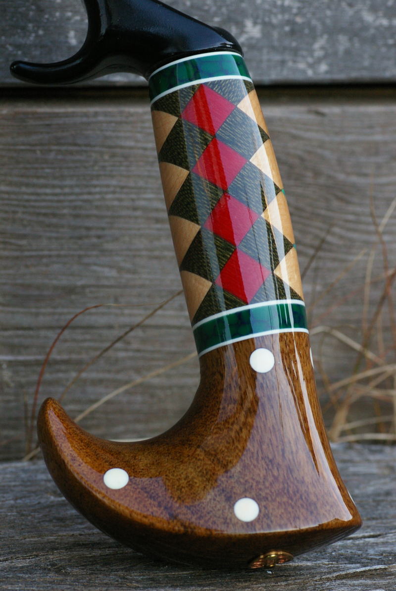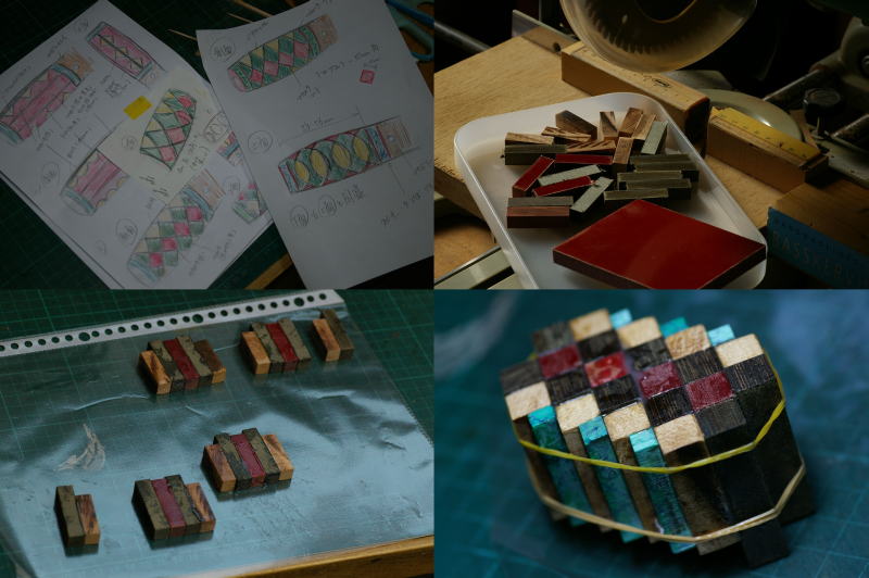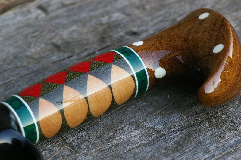 | ■今まで製作してきたカスタムグリップの中で、1、2を争うほど製作難度の高かったカスタムグリップがこちら。最初に、ユーザー様からおおよそのイメージを図面にてお伝え頂き、それを基に、当方にて完成イメージ図を描いたりしながら、何度か打ち合わせを行った後に製作を開始したのですが、計算通りに図柄を出すのに相当苦心しました。 製作者だけでは決して思い付かないようなデザインやアイデアをユーザー様から御提案頂き、そしてそれを形にしていく事で、製作者側としても、新しい技術やノウハウを習得できたり、今まで見えなかった部分に気付いたりする事ができるのが、カスタムグリップの面白いところでもあります。 |
