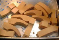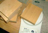 @使用するのは25o厚のジェルトン材。比較的カーヴィングしやすい木材です。その反面、ヒノキの様な「硬さ」や「滑らかさ」が無いので、しっかりとした下地を作る必要があります。ただ、ちゃんとした処理をすれば、木面が割れたり裂けたりしにくいルアーを作れるのがこの木の長所です。画像の様なブロック状で製材屋から入ってきますが、ジェルトン材は部位によって比重が0.30〜0.50とバラツキがあるので、計量してから使用します。勿論、適さない物はハジかれるわけですが、製材屋に注文する際、比重までは指定できないので、ロスが大量に出てしまうのが目下の悩みのタネです。 |