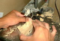 B糸ノコ盤を使ってトレース線に沿って切断していきます。線からズレないよう、また切断面が垂直になるよう注意が必要です。垂直にならないと、その後のカーヴィングで苦労します。 |
