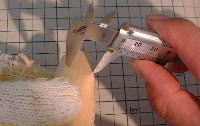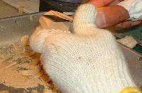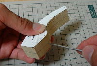 Gいよいよ、ここからがビルダーの腕の見せ所です。基本的には替刃式のカッターナイフ(刃は「特選黒刃」を使用)で成型しますが、エグレた部分がある場合などは小刀を使用します(Jack-O Popperでは出番はありません)。基本的にジェルトンはカーヴィングしやすい部類の木材ですが、刃を入れる角度や方向を誤ると、ゴッソリと余計な部分まで削れる恐れがあるので注意が必要です。 |
