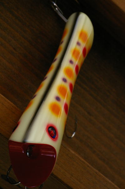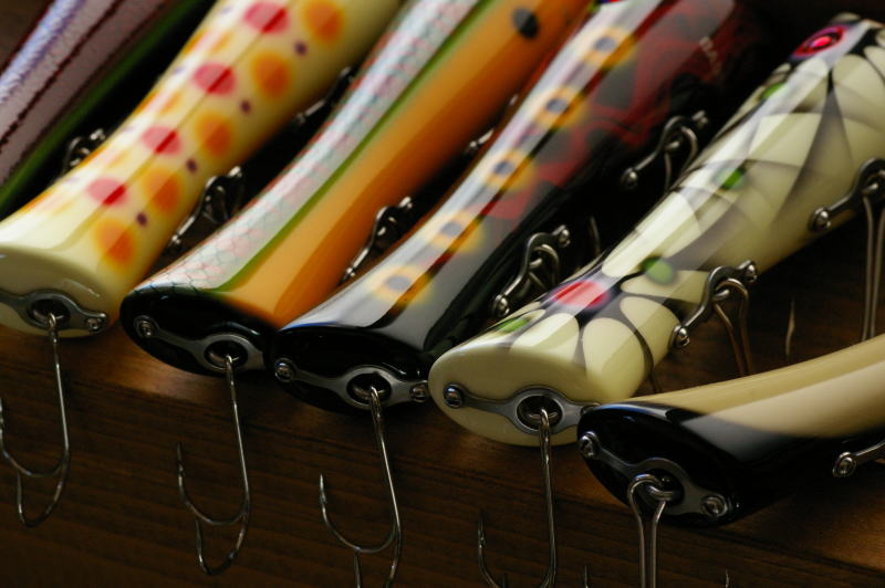 “フィッシュテイル” がそのフォルムとアクションに個性を与えています。 ■丸く深いカップは甘く大きなカップサウンドを発生させ、細くくびれたウエストはダイブ時の左右へのダートを生み、そしてその独特な形状のフィッシュテイルはダイナミックに水を撹拌します。 ■上下方向に張り出したフィッシュテイルは浮力を発生させ、また、水面上にテイルが大きく露出するため、視認性に優れます。 ■テイルエンドが斜めにカットされている事により、ダイブアクション後に浮上する際、より強いキックバックを生じさせます。 ■縦扁平のフィッシュテイルに起因するダイブ時の姿勢の良さ(ボディが左右に傾かない)、くびれたウエストと、そこから続くシェイプされたテイル部、それら複数の要因により、フッキングは非常に良好で、貴重なバイトを逃しません。 |
